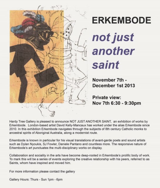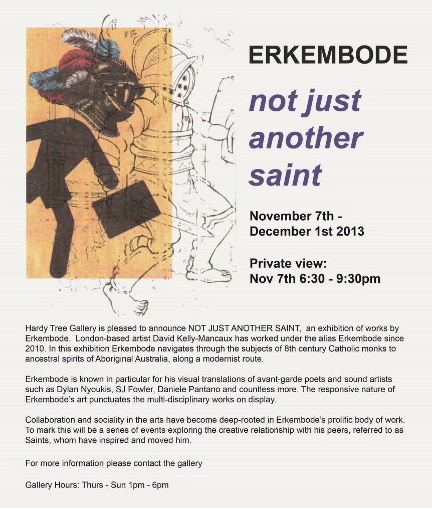 Over at the Hardy Tree Saint Erkembode is opening his exhibition tomorrow. Near Kings Cross London. A nice intimate space. Outsider art. No academic bullshit!!