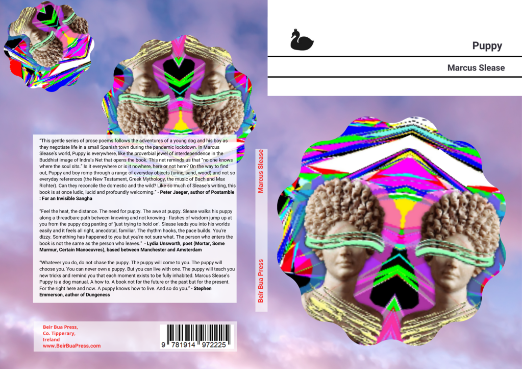 “This gentle series of prose poems follows the adventures of a young dog and his boy as they negotiate life in a small Spanish town during the pandemic lockdown. In Marcus Slease’s world, Puppy is everywhere, like the proverbial jewel of interdependence in the Buddhist image of Indra’s Net that opens the book. This net reminds us that “no one knows where the soul sits.” Is it everywhere or is it nowhere, here or not here? On the way to find out, Puppy and boy romp through a range of everyday objects (urine, sand, wood) and not so everyday references (the New Testament, Greek Mythology, the music of Bach and Max Richter). Can they reconcile the domestic and the wild? Like so much of Slease’s writing, this book is at once ludic, lucid and profoundly welcoming.” – Peter Jaeger, author of Postamble : For an Invisible Sangha